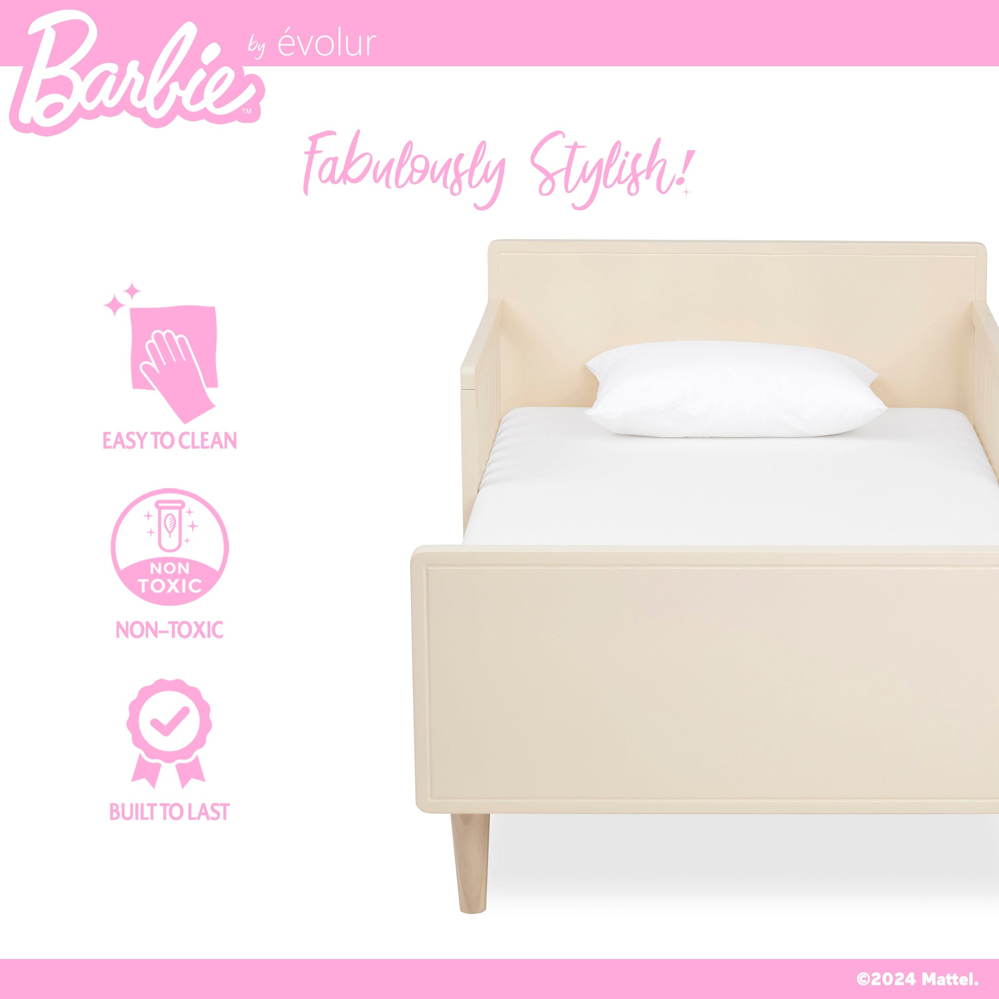 Thoughtfully designed for your growing dreamer, the Barbie™ by Evolur Los Altos Toddler Bed is a cozy first step toward independence—bringing charm, safety, and comfort to every bedtime routine.