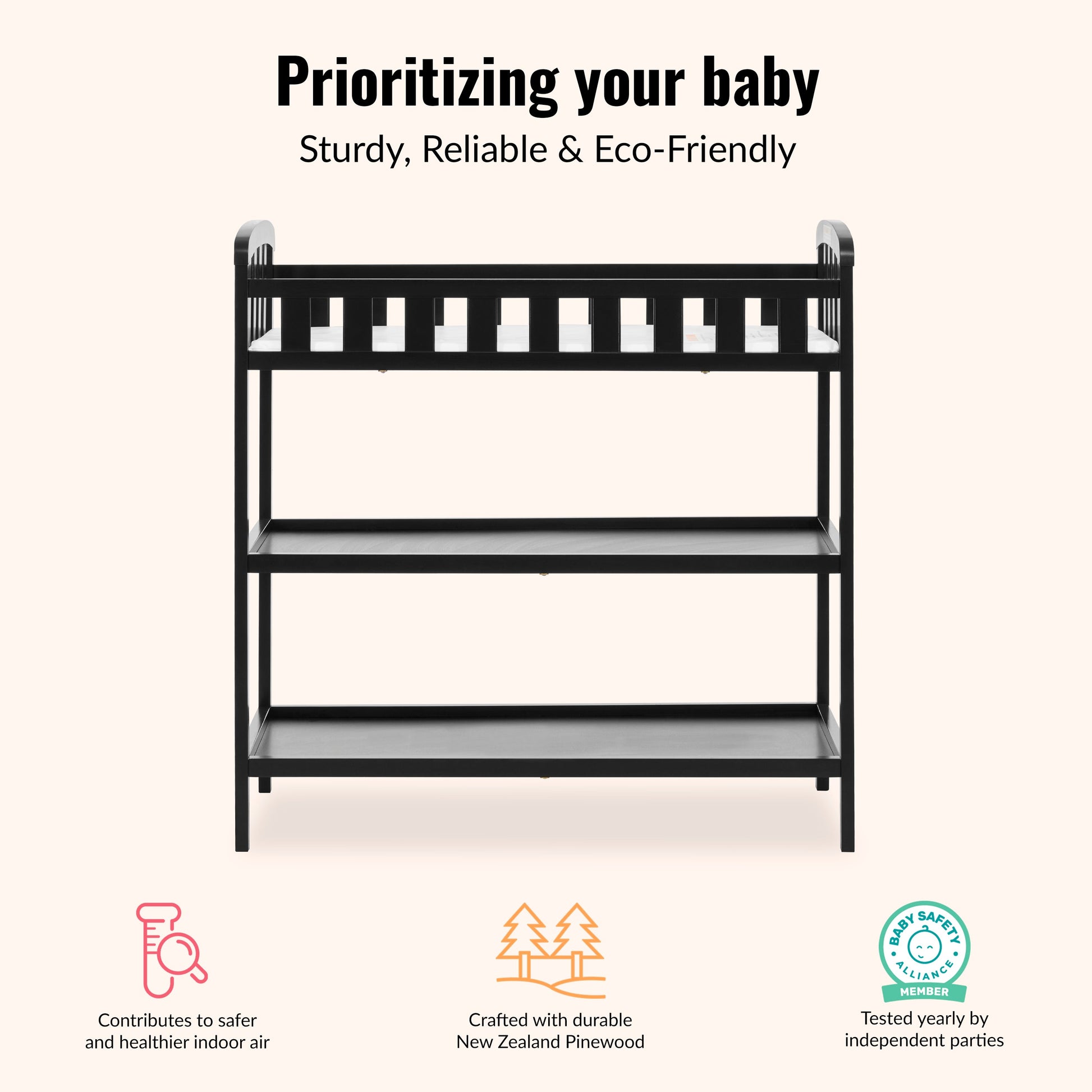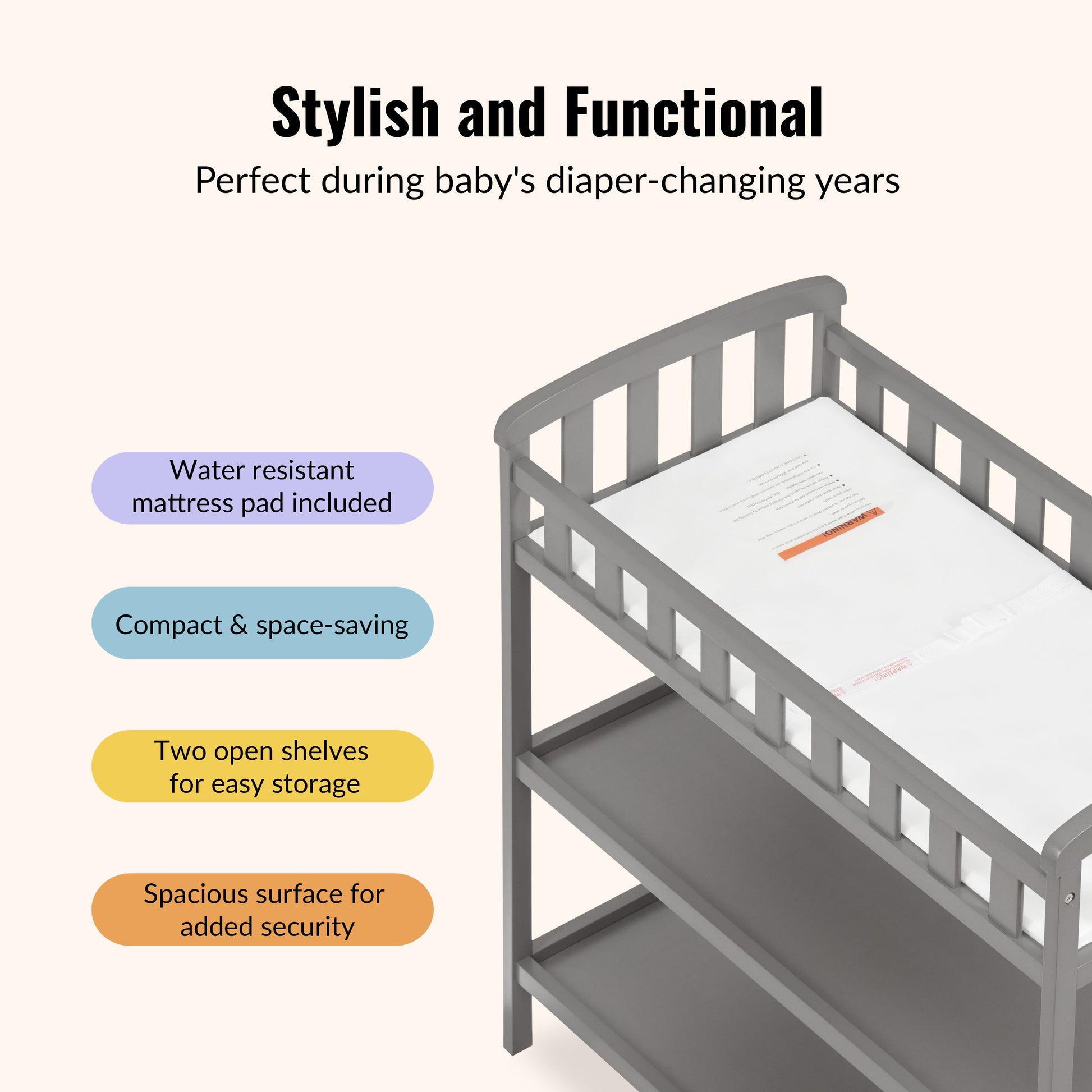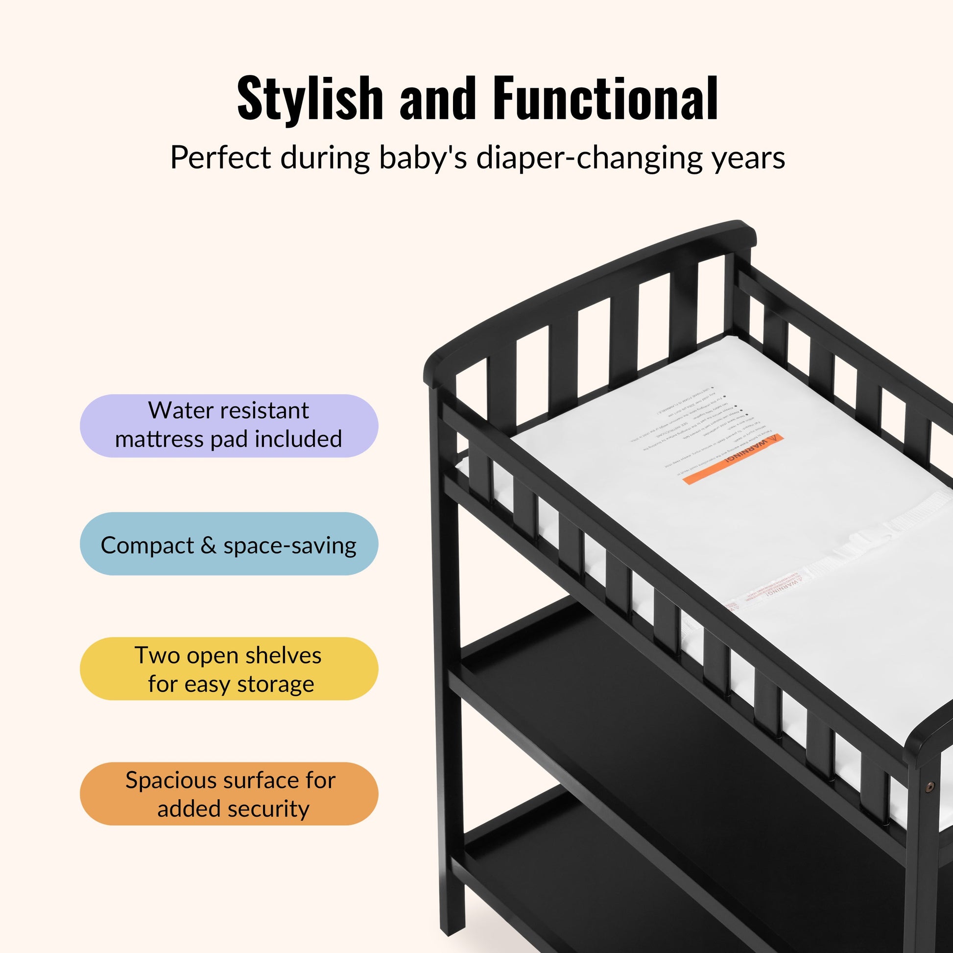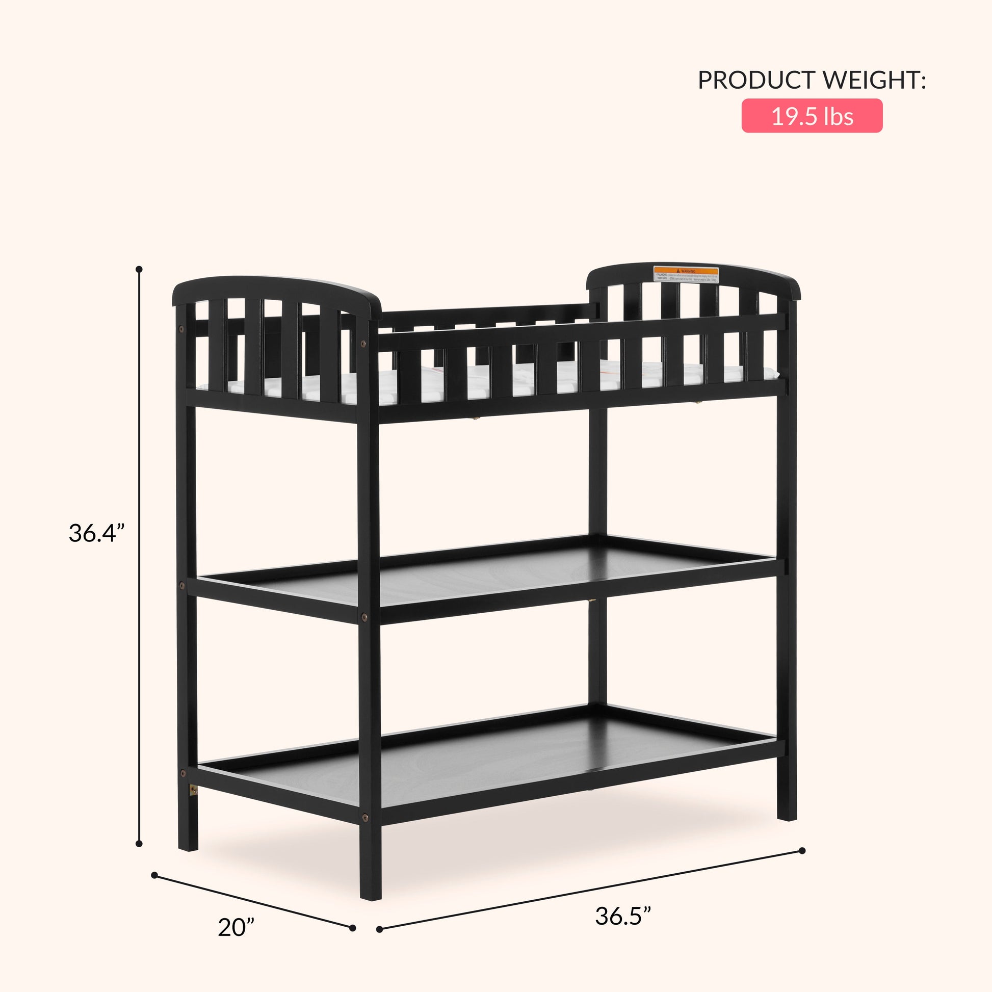 A nursery essential—made beautifully compact. The Dream On Me Emily Changing Table combines smart design with timeless style to give parents a secure, convenient place for diaper changes. Lightweight and easy to move, it features a sturdy build, two spacious shelves for baby’s must-haves, and a 1" pad for comfort. With safety rails on all four sides and a range of elegant, non-toxic finishes, Emily makes changing time a breeze—anywhere in your home.