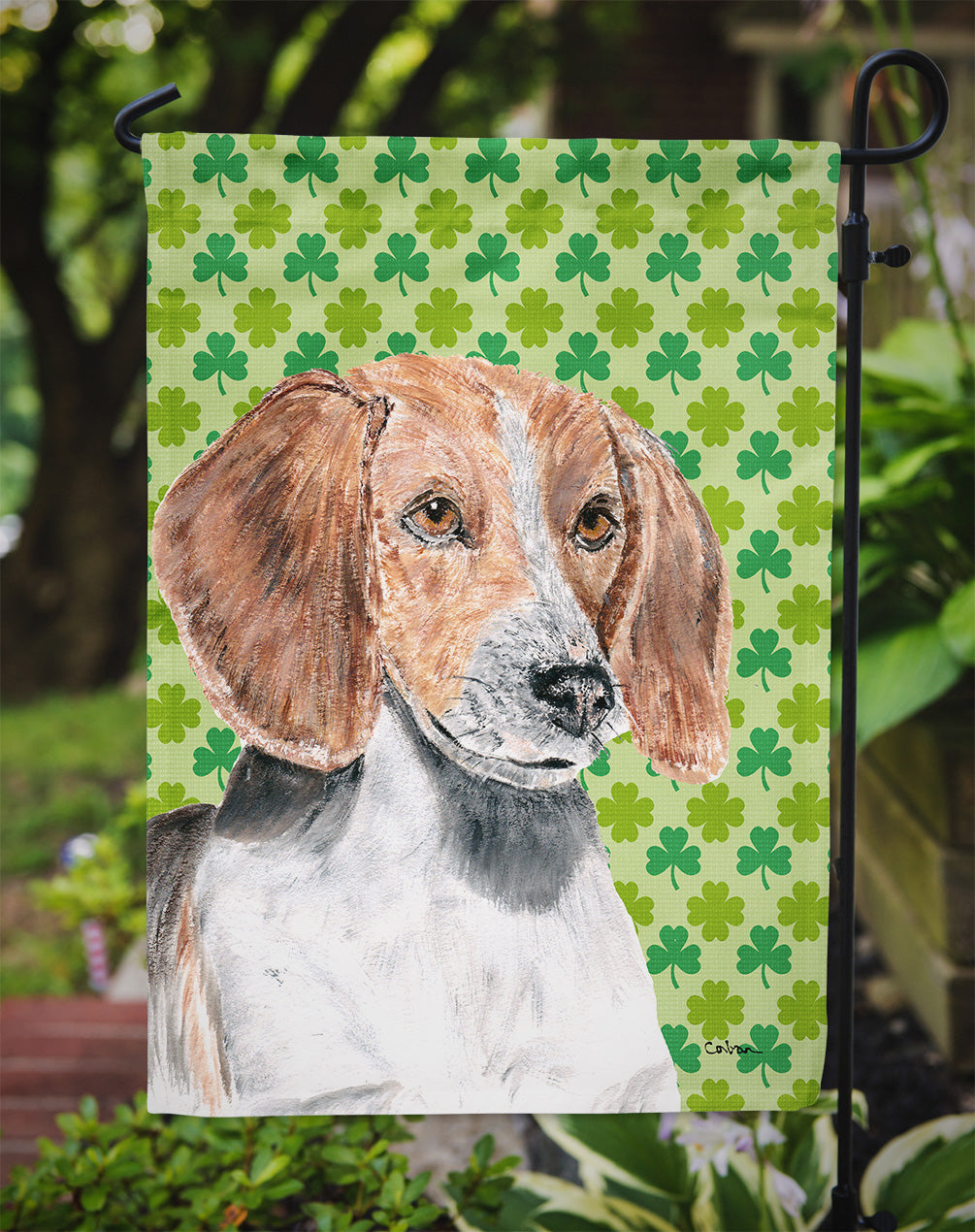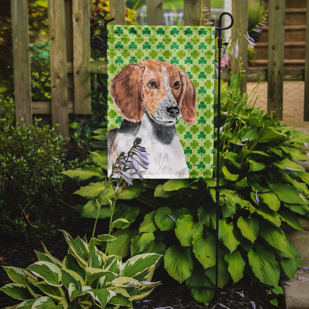 Decorate your space with our St Patrick's Day English Foxhound artwork on a Garden Flag. Enhance the beauty of your garden, patio, or yard with Caroline's Treasures Decorative Garden Flag, proudly made in the USA. Crafted from two pieces of thick, double-sided polyester fabric, this 2-ply garden flag is designed to withstand various weather conditions, making it water-resistant and weatherproof. Featuring correctly readable words on both sides, this garden flag offers a delightful visual experience from any angle. With its heavier weight, it stands out among other garden flags, ensuring stability and durability even in wind, rain, and snow. Measuring approximately 11 1/4 inches by 15 1/2 inches, this flag allows you to personalize your outdoor decor. It comes with a 1 1/2-inch sleeve sewn in, allowing easy attachment to any standard garden flag stand or garden size porch hanger (sold separately). Make a statement in your outdoor space with Caroline's Treasures Decorative Garden Flag, a vibrant and high-quality flag that adds color and personality to your surroundings. Proudly made in the USA, it's a symbol of quality craftsmanship and attention to detail.