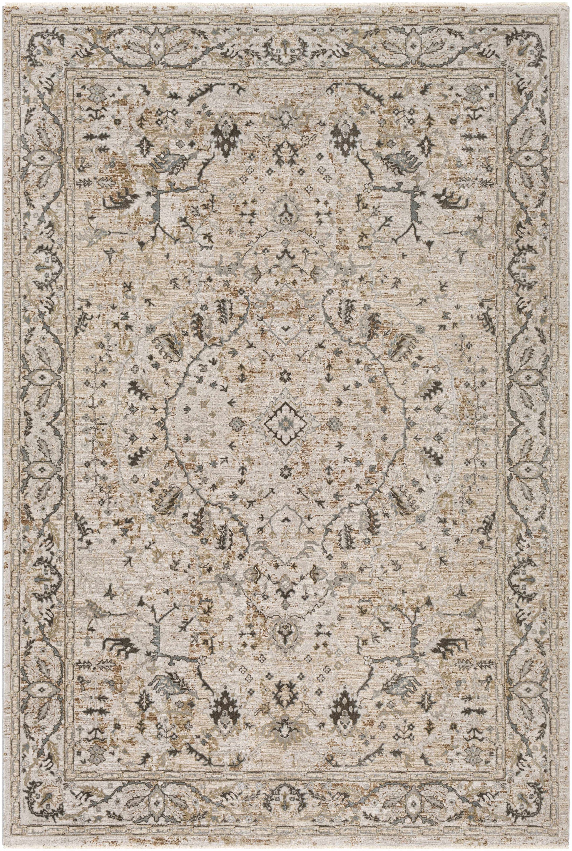The Hauteloom Laughlin Rug brings a classic traditional look to any room with its elegant blend of Gray, Taupe, Beige, Medium Gray, Teal, Olive, and Sage tones. Machine woven in Turkey from a durable mix of polyester and polypropylene, it offers a soft medium pile (0.35") and a comfortable 0.43" total thickness. Finished with a subtle 0.6" fringe, this rug combines timeless style with easy care.