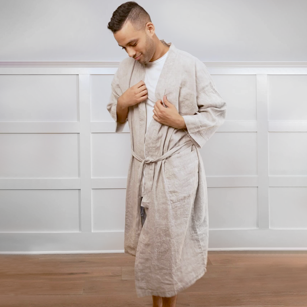 This bathrobe is made with softened light and breathable linen, and perfectly fits for use after showering or home lounging.