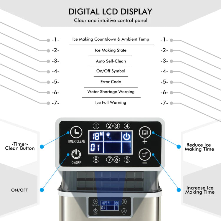 Convenient Self-Clean Mode: Features a 24-hour timer, with the option to delay ice-making by up to 8 hours; self-cleaning mode lasts 20 minutes for easy maintenance.