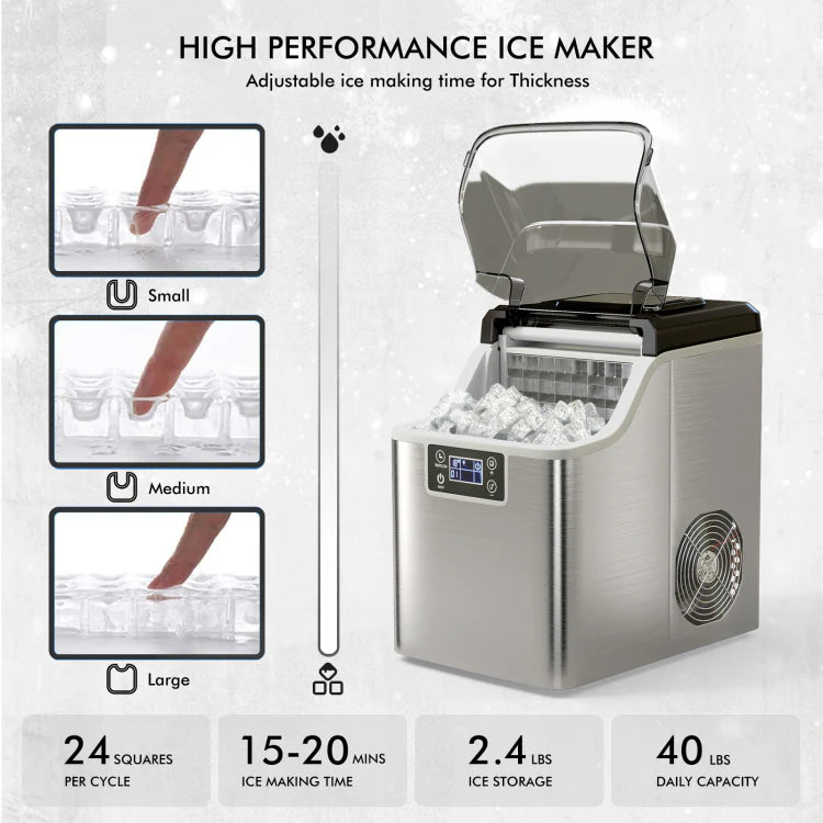 Fast Ice Production: Makes 24 ice cubes in just 15 minutes, producing up to 40 lbs of ice per day.