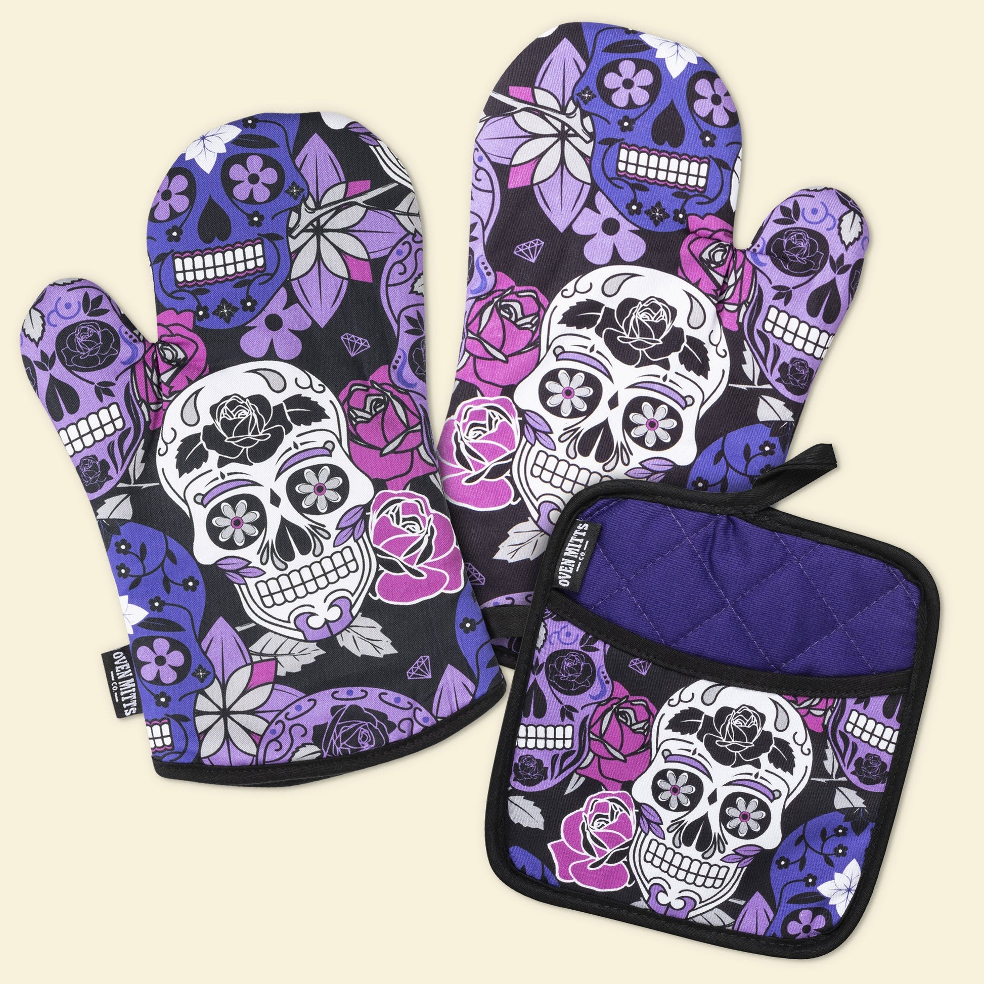 Sugar Skull Purple Oven Mitts And Potholder Set