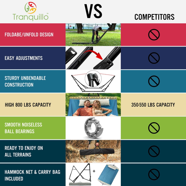 - PATENTED INNOVATIVE DESIGN: Proudly patented for its smart, tool-free setup in just 30 seconds, the Tranquillo Hammock with stand offers effortless outdoor relaxation. Easily adjustable for perfect comfort, built with durable materials for long-lasting use
