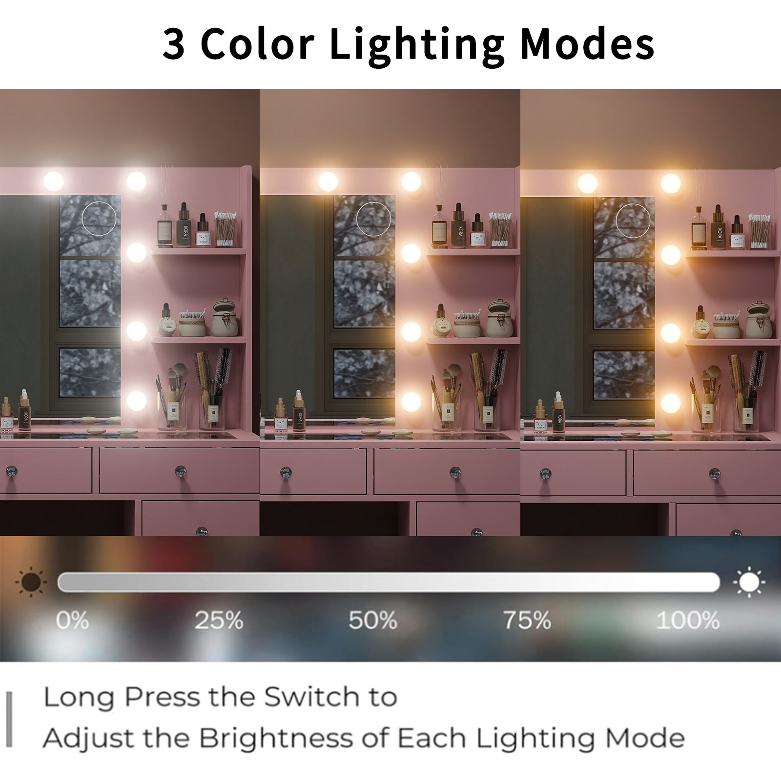 Upgrade your beauty space with the Yanosaku VD010 Makeup Vanity Desk, designed for organization, comfort, and perfect lighting. With a spacious glass tabletop, 9 storage drawers, and foldable side panels, this vanity keeps all your essentials within reach. The 12 LED bulbs offer 3 lighting modes for flawless makeup application, while the built-in power outlet ensures your devices stay charged. Paired with a soft, cushioned stool, this vanity blends style and function in one elegant setup.