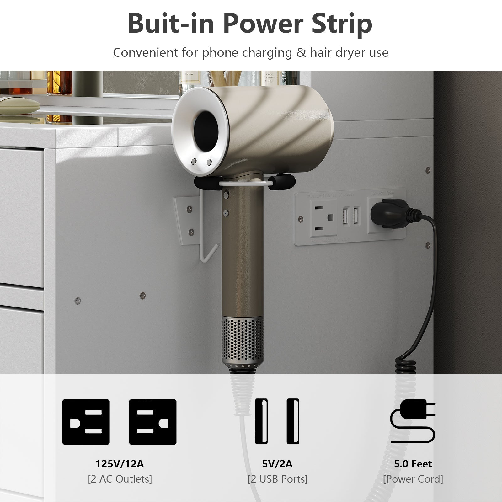 Built-In Power Station with 2 outlets + 2 USB ports for hair tools, phones, and devices