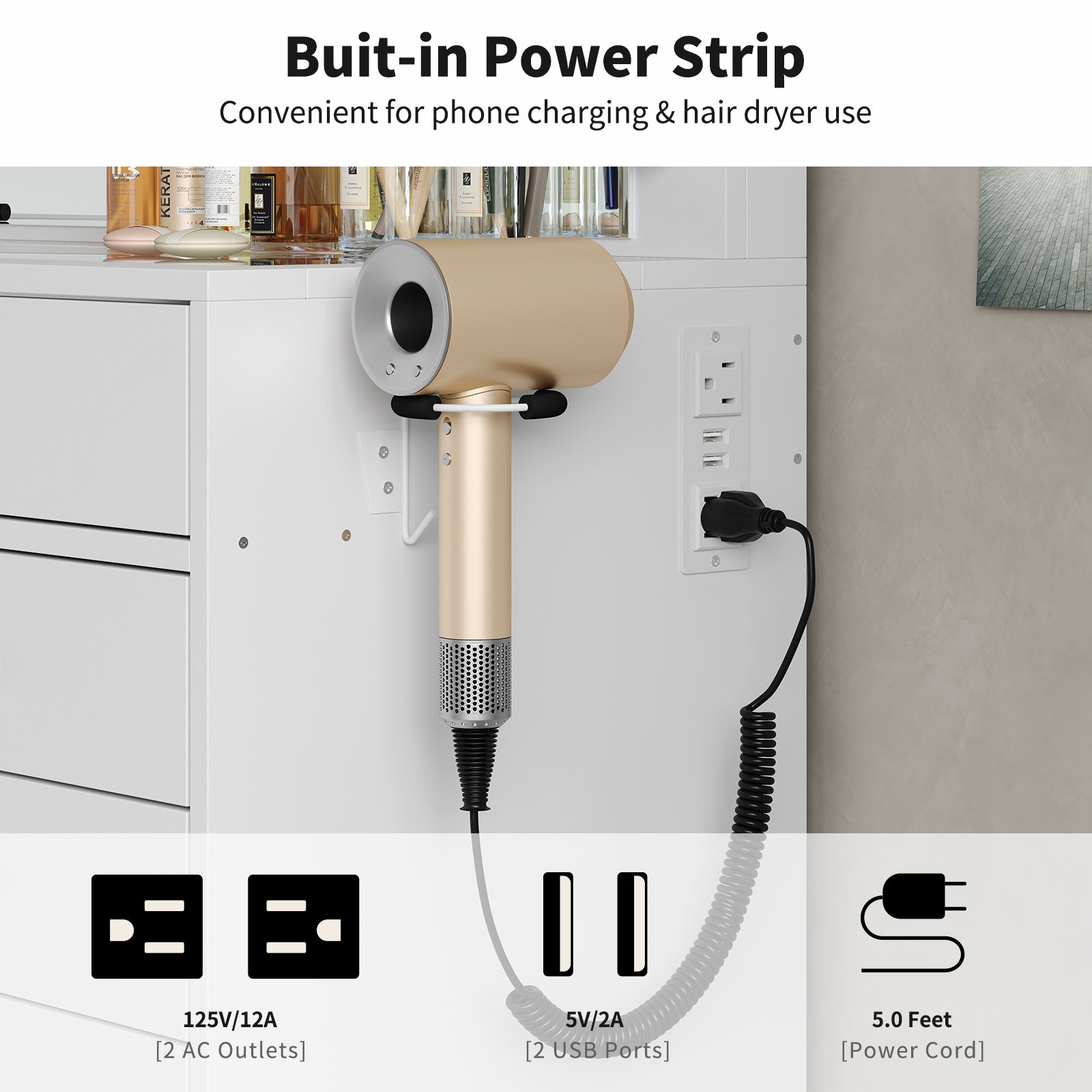 - Come with Charging Station: This makeup vanity is with a hair dryer stand and power outlet. The power outlet includes 2 standard plug sockets and 2 USB ports to connect your hair dryer, curling iron, computer, cell phone, iPad and other devices