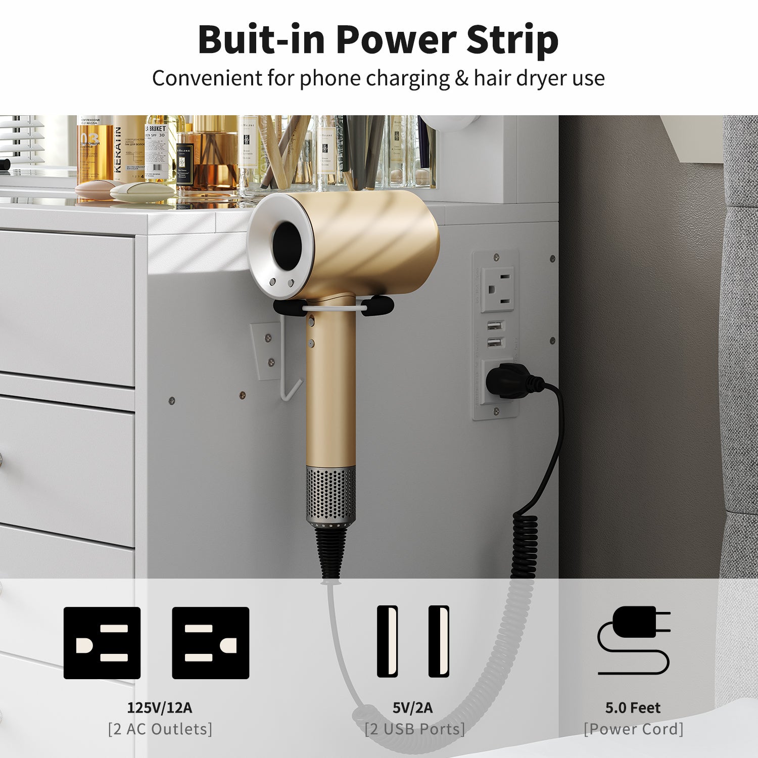 Built-in charging station with 2 AC outlets + 2 USB ports