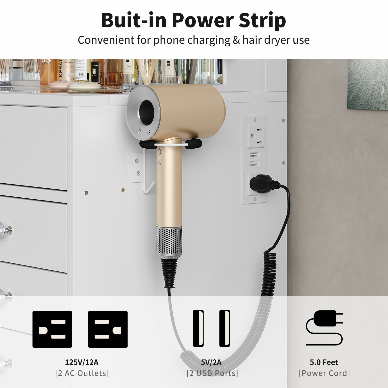 - Convenient Power Station: Stay charged and connected with the built-in power outlet, featuring a dedicated hairdryer rack along with 2 standard plug sockets and 2 USB ports. This makeup vanity allows you to power up your devices or styling tools while you effortlessly create your perfect look