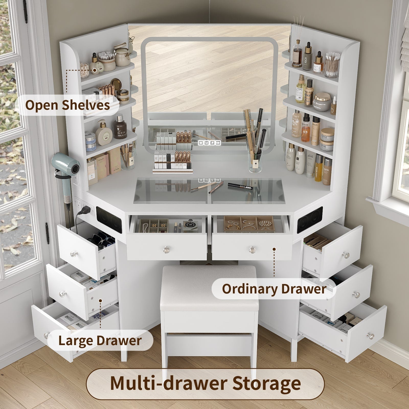 Corner Makeup Vanity, with Bluetooth, White