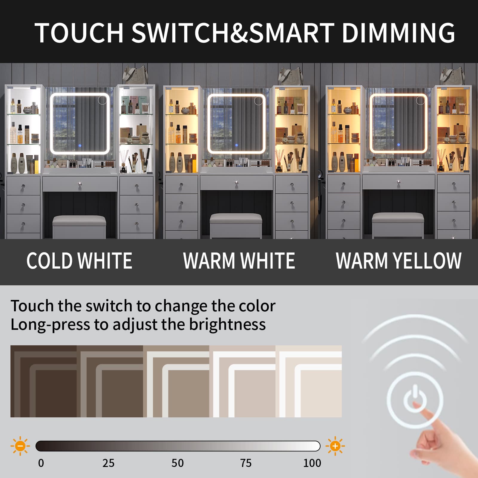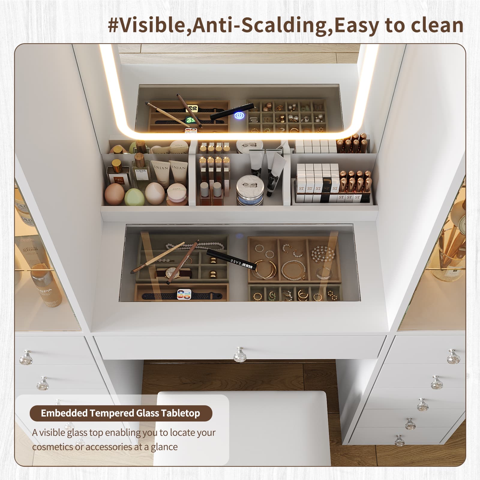 - Massive Storage & Sleek Organization: Never clutter your space again! Featuring 11 large sliding makeup drawers and 2 lighted storage cabinets, this vanity keeps your beauty area well-organized. The cabinets include adjustable shelves, allowing you to customize the layout to suit your needs. Perfectly designed to hold all your cosmetics while keeping everything visible and within reach.
