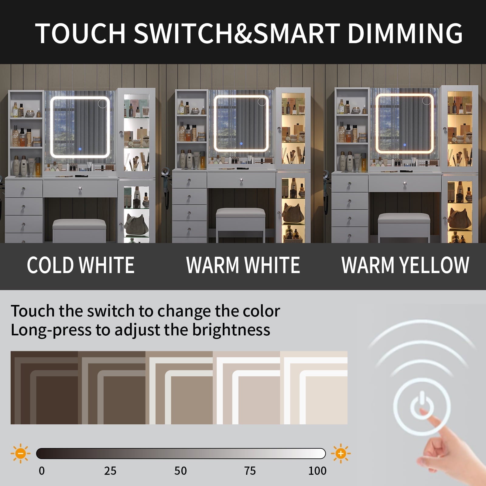 - Smart LED Lighting: Get studio-quality illumination with touch-sensitive controls. Choose from 3 lighting modes (cold light, natural light, warm light) and adjust the brightness. The 120 high-efficiency LED beads deliver perfect, shadow-free illumination for makeup and styling.