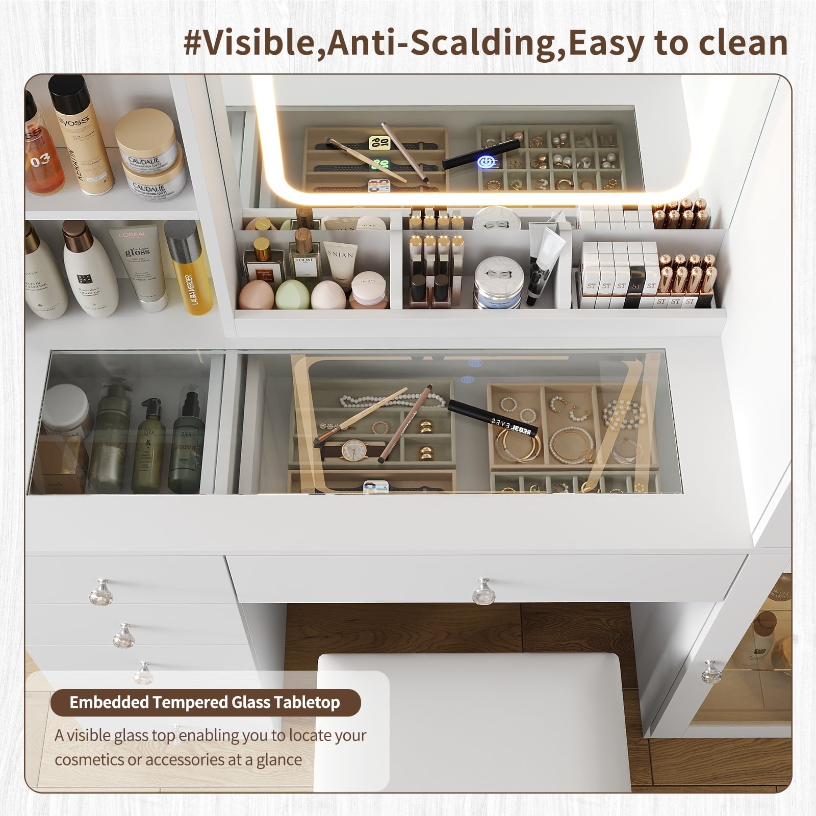 - Massive Storage & Sleek Organization: Never clutter your space again! Featuring 6 large sliding makeup drawers, 2 open shelves, and 2 lighted storage cabinets, this vanity keeps your makeup area well-organized. The cabinets come with adjustable shelves that you can customize according to your needs. This vanity can perfectly hold all your cosmetics, keeping everything visible and within reach.