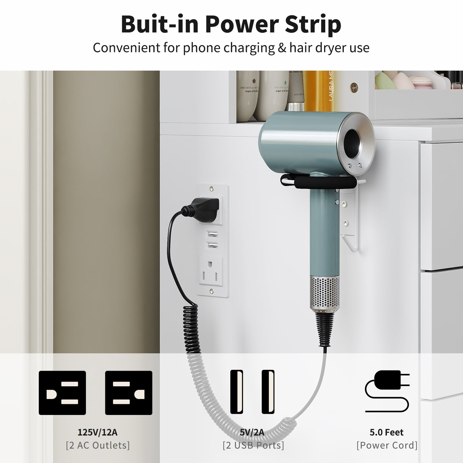 - Built-in Power Station: This vanity desk comes with a built-in hair dryer stand and a charging station. It includes 2 AC outlets and 2 USB ports, so you can easily charge your phone or tablet, or plug in styling tools like hair dryers and curling irons—no more messy cords!